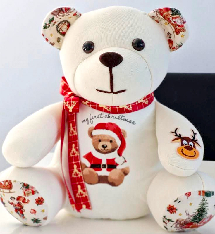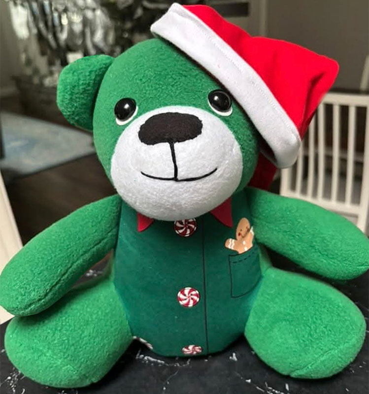 Jan Hoffman used a baby’s first Christmas outfit fabric for the body of the Ben the BEGINNER Bear. Ben is a perfect fit for a baby Christmas keepsake.