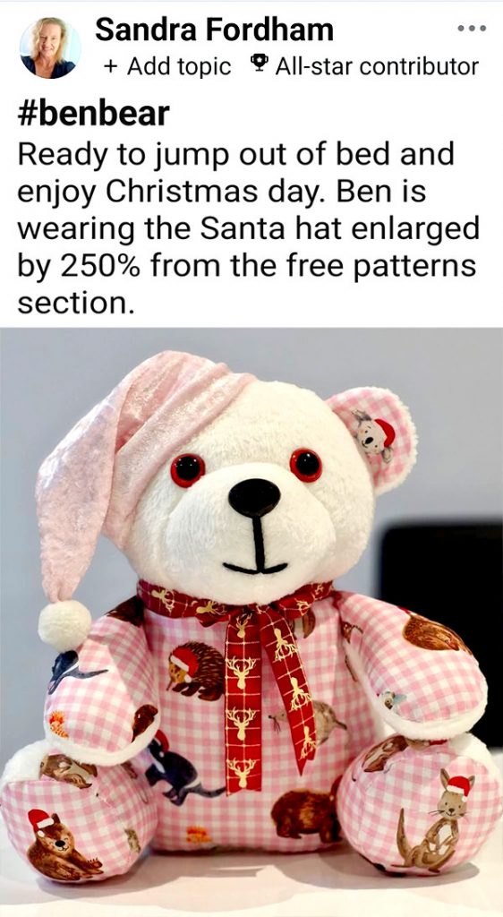 Here is another delightful Ben the BEGINNER Bear sew by Sandra Fordham. She used the single piece tummy to show off a Christmas message, and also added holiday fabric to the paws and ears.