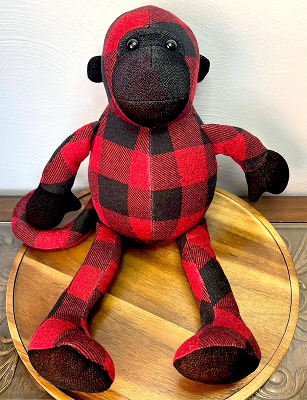 Mitch the Monkey looks great in buffalo plaid, as sewn by Lindsey Mortimer. Mitch looks especially cute as a clothing keepsake, at Christmas or any time of year.
