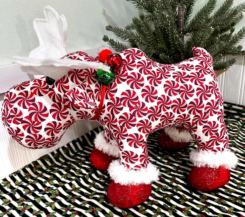Santa can’t get around on his own, so let’s look at some of his fashionable reindeer helpers.Β Pat Ranger used teddy fur (also known as sherpa fabric in some places) on her Reggie Reindeer. I like the mix of fabric textures on this cheerful reindeer.