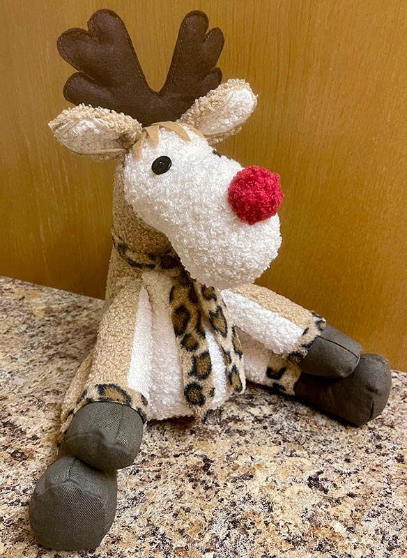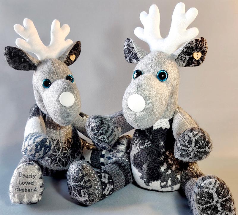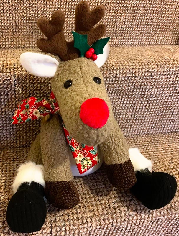 This lovely duo of Reggie Reindeer (sewn in two different sizes) is made from the holiday sweater of a much missed loved one. These toys were sewn by Carol Jenkins.