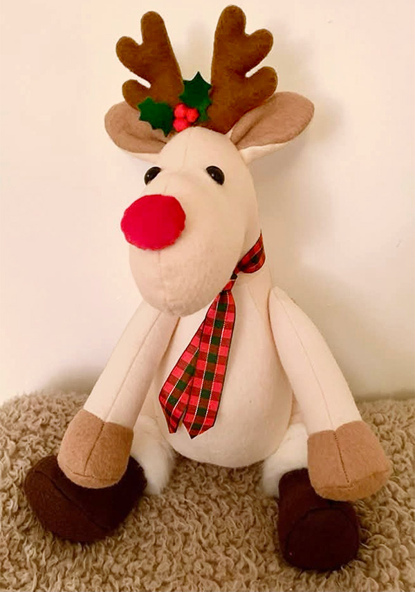 Pat Ranger also sewed this Reggie Reindeer, this time she used a light coloured fleece fabric. (I love to see how different the same toy looks in different fabrics!)