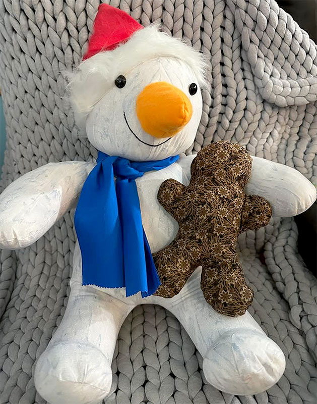 Darlene Tavernia made a memory moose from holiday clothing. I love the way she carefully placed a Santa on each antler and the tail of her Mickey Moose. Adorable!