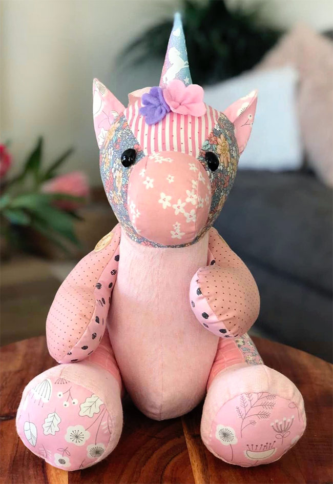 And this Kelsy Keepsake Unicorn was sewn by Carmi Kitching. She has included some pretty features from the clothing items she used to make this keepsak
