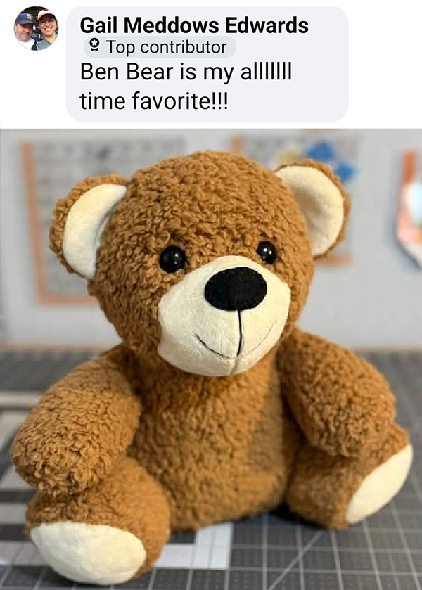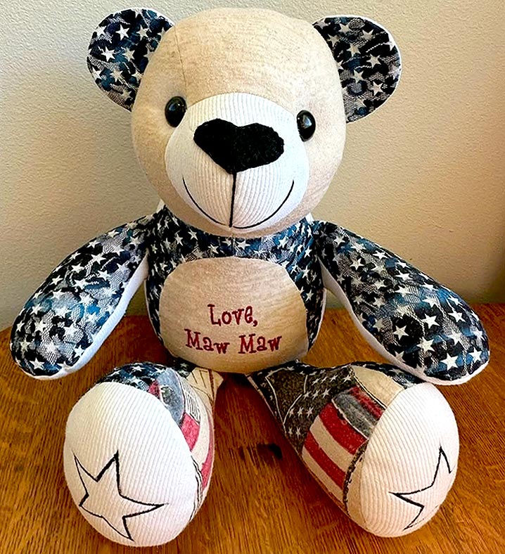 This Keep Me Keepsake Bear pattern was sewn by Jonell Hart who used the large flat spaces on the tummy and foot pad pieces for embroidery.