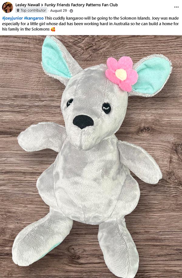 And another FFF Australian animal toy pattern that’s a firm favourite! This Joey Junior Kangaroo was sewn by Lesley Newall