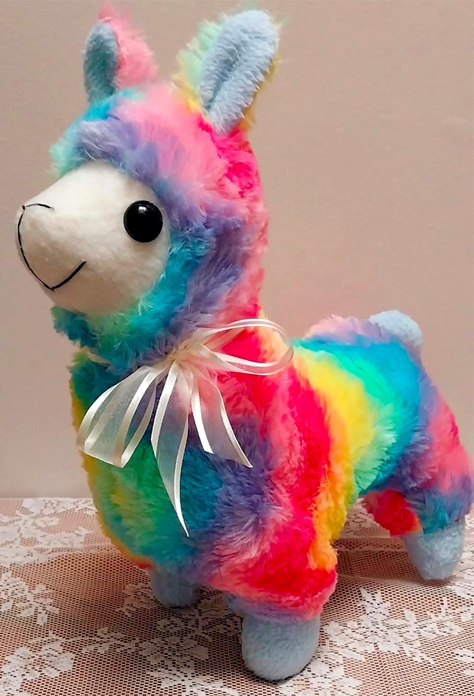 This lovely Lloyd Llama was sewn by Janet O’Neil Conlon in rainbow fake fur beautifully balanced with a pale blue fleece contrast fabric.