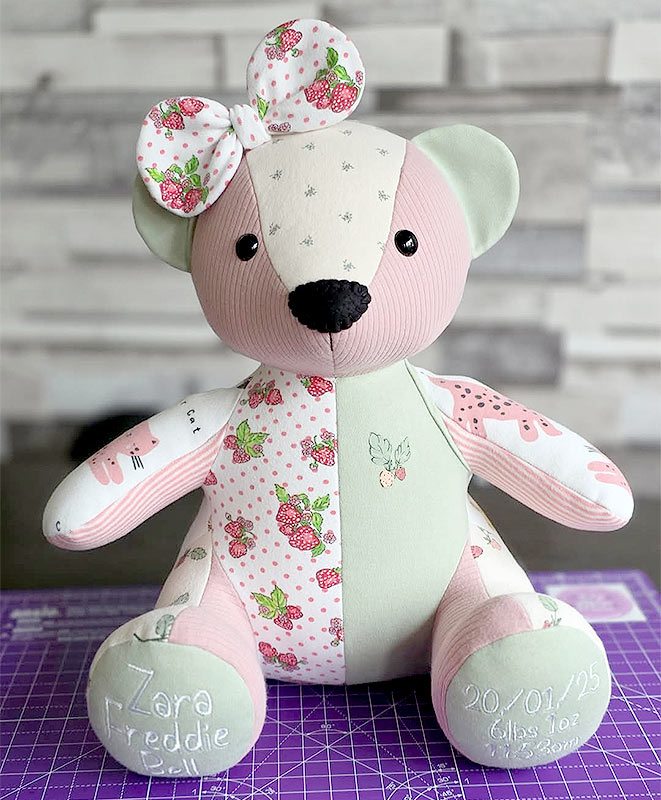 This Melody Memory Bear Pattern was sewn by Rebecca Smith out of some pre loved baby clothes to make a sweet keepsake.