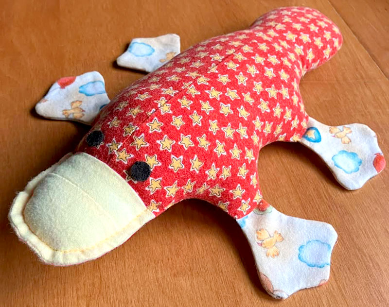 This sweet Plattie Platypus was sewn by Regina Barker out of some scraps of flannelette fabrics. (This pattern is included in my free toy-making course – see the link in the tip box below).