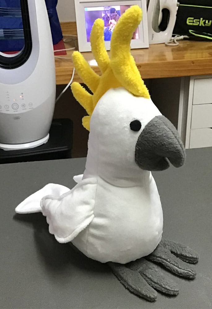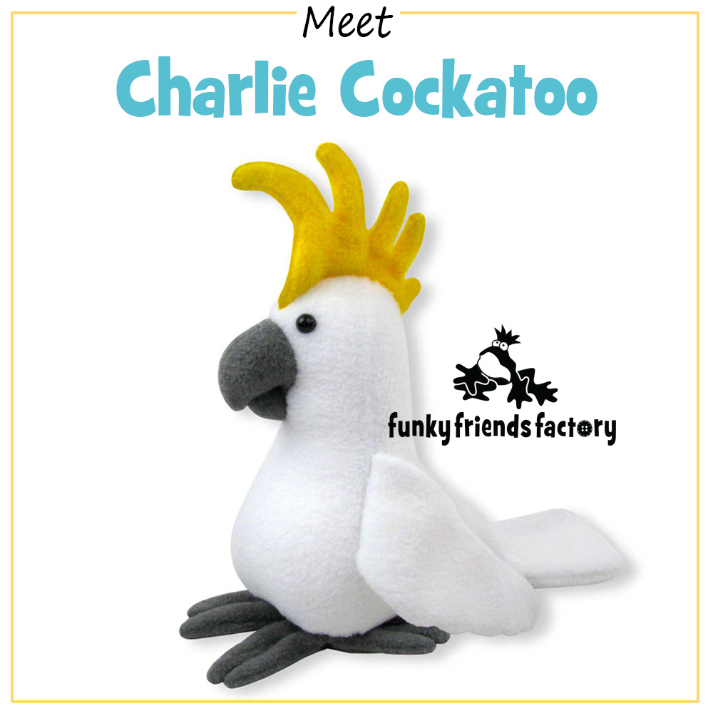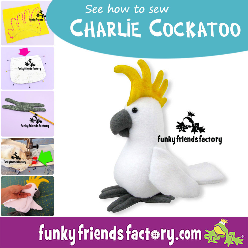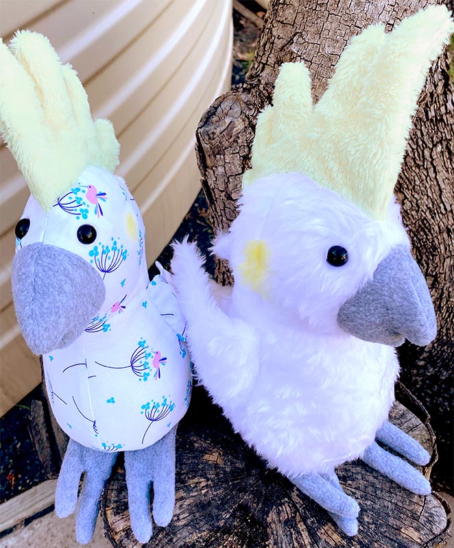 Charlie Cockatoo is one of the “Aussie Mates” (Australian) Funky Friends toy patterns and he has been really popular with children who seem fascinated by his wacky Sulphur yellow crest. This blog post covers all of the vital details on Charlie Cockatoo, such as pattern size, difficulty level, the best fabrics to use, how to achieve the look of feathers, and examples of Charlie sewn in both realistic and wild colors.