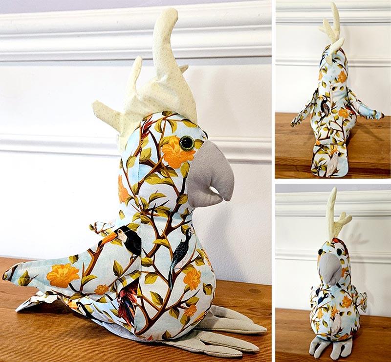 On the opposite side of the stretchy fabric spectrum is quilting cotton, which does not stretch. However, unlike minky or fleece, quilting cotton comes in lots of delightful small prints like this cockatoo print fabric that Glenda Muchow used for her Charlie Cockatoo!