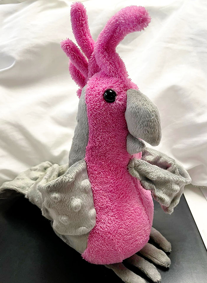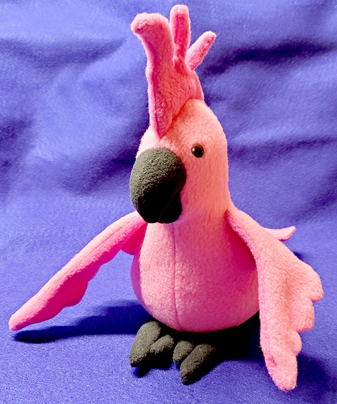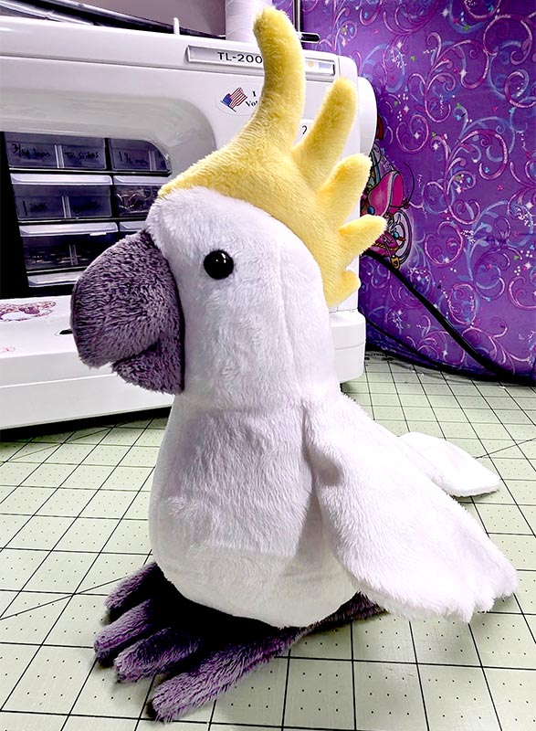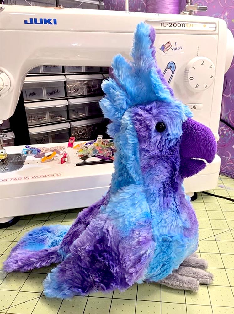 What a perfectly coordinated bird! Melissa Cochrane used a tie dye, long-pile minky for the body on this Charlie Cockatoo and matched the beak in a solid purple. The grey feet are made from a lower pile minky..
