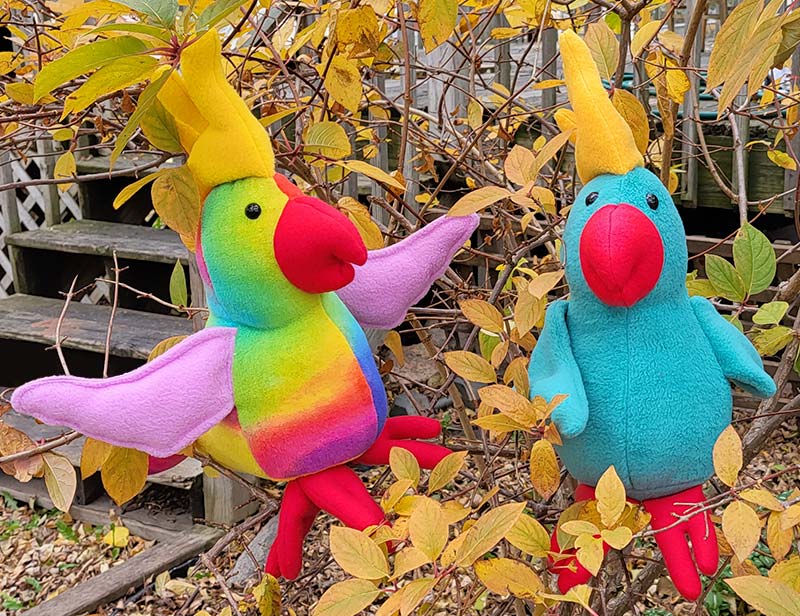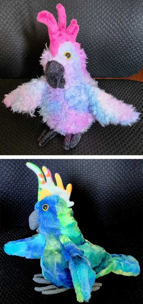 Another feathery option is low-pile fake fur, which you can see on the Charlie Cockatoo on the right below, sewn by Janet Radke. The bird on the left is made from quilting cotton, and both toys have a Sulphur crest made from minky, which comes in various levels of fluffiness depending on the brand. Minky is often more of a “baby chick” level of fuzz. The beaks and feet on both of these toys are made from fleece.