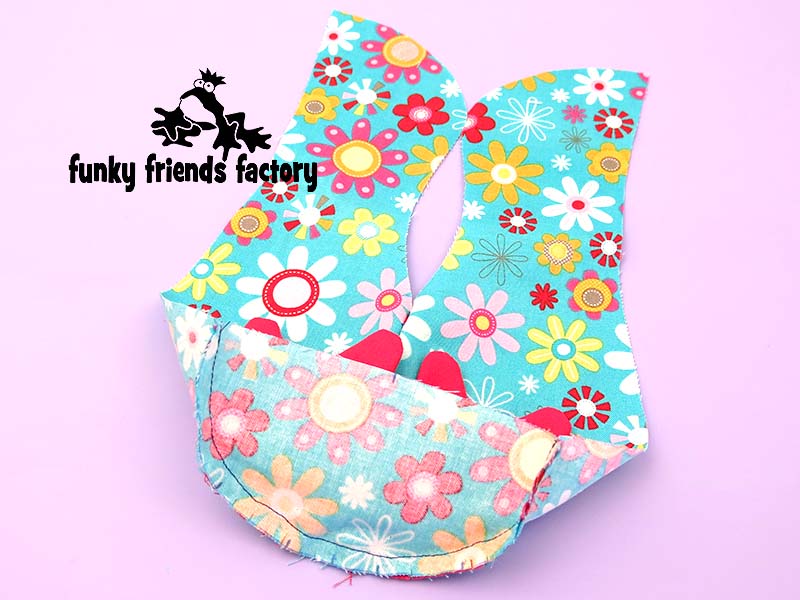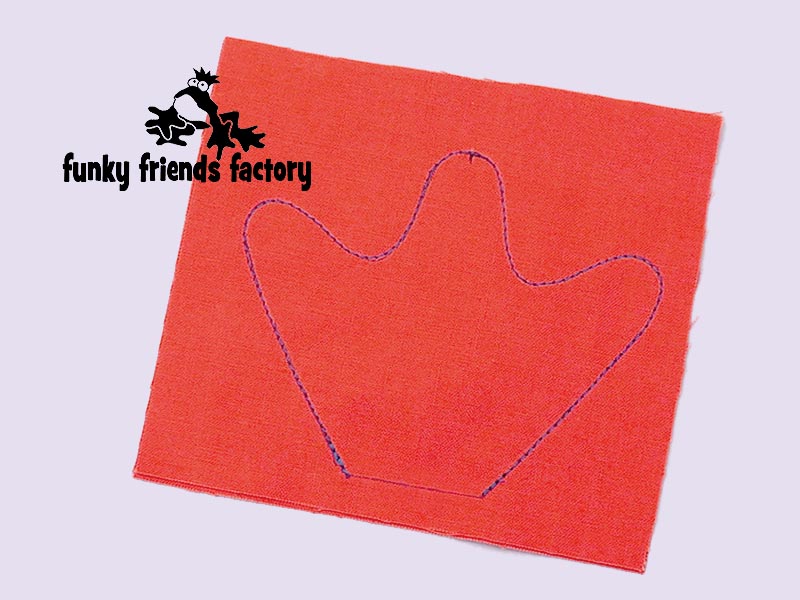 Sew the GIBLET PIECES together on the sewing line, leaving the straight edges open. Cut the GIBLET PIECES out with a 5mm/¼inch seam allowance (outside the dashed sewing line). Clip the seams very well and cut the ‘v’- shape out of the top of the GIBLET PIECES, as shown on the pattern markings (this creates a turning gap for turning the giblets inside out).