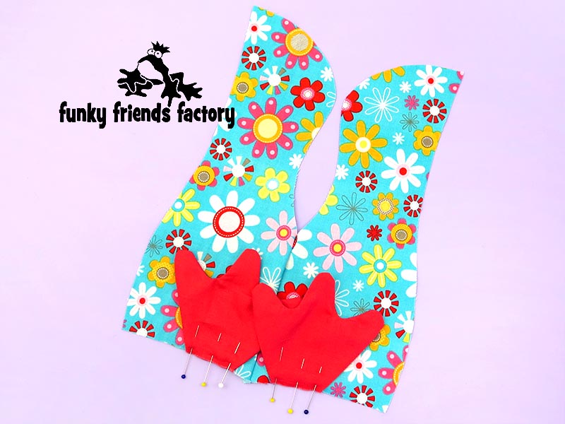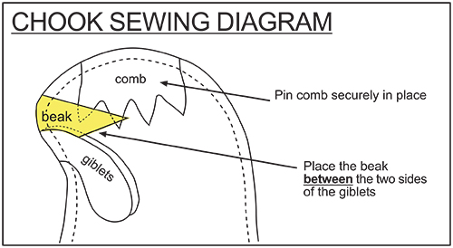 Pin the COMB in position using the pattern markings and the CHOOK SEWING DIAGRAM to guide you. Fold the GIBLETS and place the bottom of the BEAK between the top of the GIBLETS.