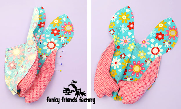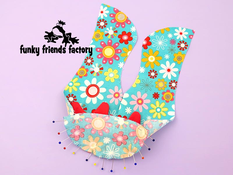 Stuff a small amount of toy stuffing into each wing, just enough to give them some ‘body’ leaving the top 2-3cm (1 inch) free of toy stuffing. (This is so the wings will be nice and floppy!) Pin the wings closed along the straight edge.