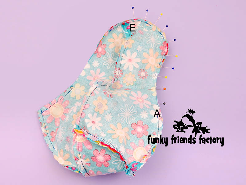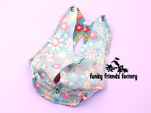 Sew the side seams from E down one side, around to D and back up the other side to E again.