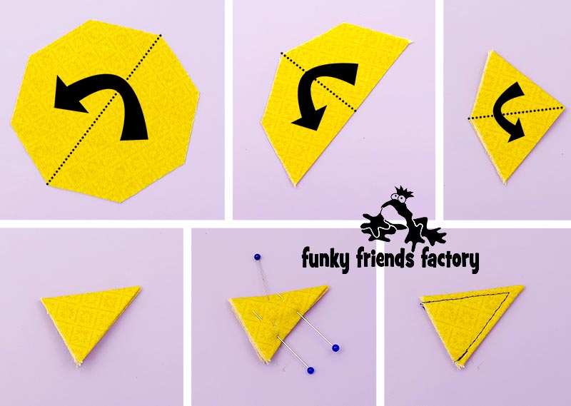 Fold the BEAK PIECE in half with the fabric wrong sides together. (Use an iron to get a neat fold). Repeat this 2 more times (ironing each time you fold) to form a triangle shape for the beak. Sew along the beak edge to give a nice neat finish.
