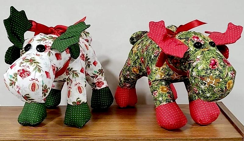 This twin-set of Reggie Reindeers was sewn by Holly Boatright in traditional Christmas colours. She has added a fun bow tie sewn from Christmas fabric.
