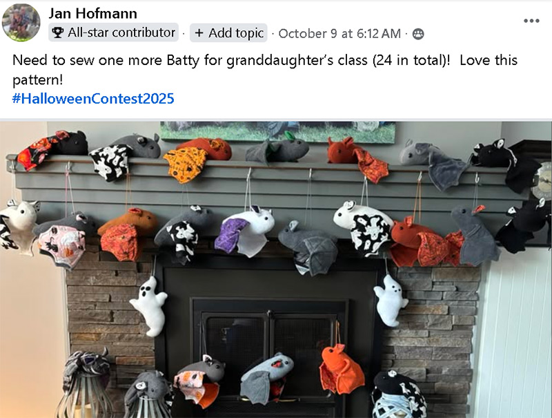 Halloween parties are such a fun part of autumn school activities for many small children. Some classes get extra special treats! Jan Hoffman sewed 24 Batty Bats this year for her granddaughter’s class – it looks to me like each one is different, too!