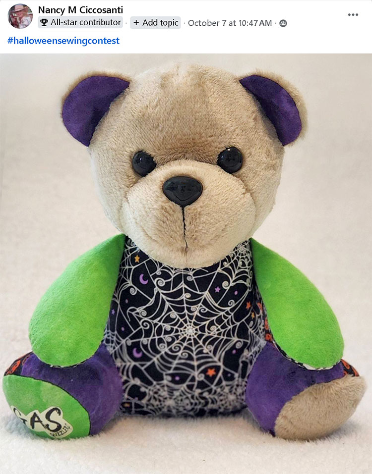 Nancy M Ciccosanti sewed this beautiful Halloween version of Ben the Beginner Bear. She has fussy cut the fabric specially to place the spider web in the middle of his tummy! Ben was designed with a single piece, “no seam” tummy panel for showing off special designs like this one.