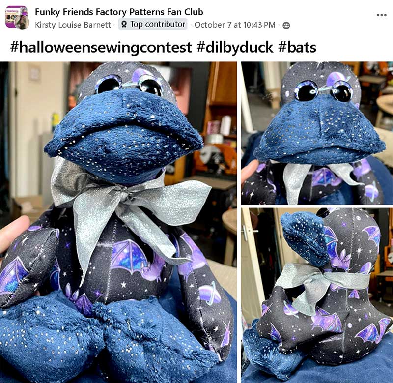 Kirsty Louise Barnett sewed Dilby Duck in a bat fabric combined with sparkly minky. How fancy!!