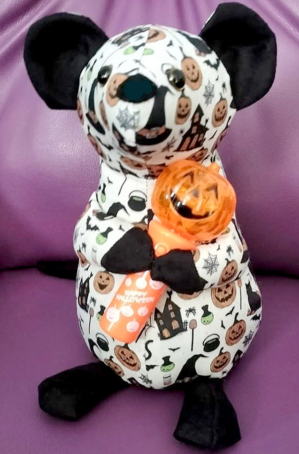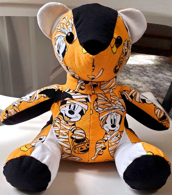 Darlene Tavernia sewed Melody Memory Bear in Disney Halloween fabric! She perfectly placed Mickey & Minnie on each side of Melody’s tummy.