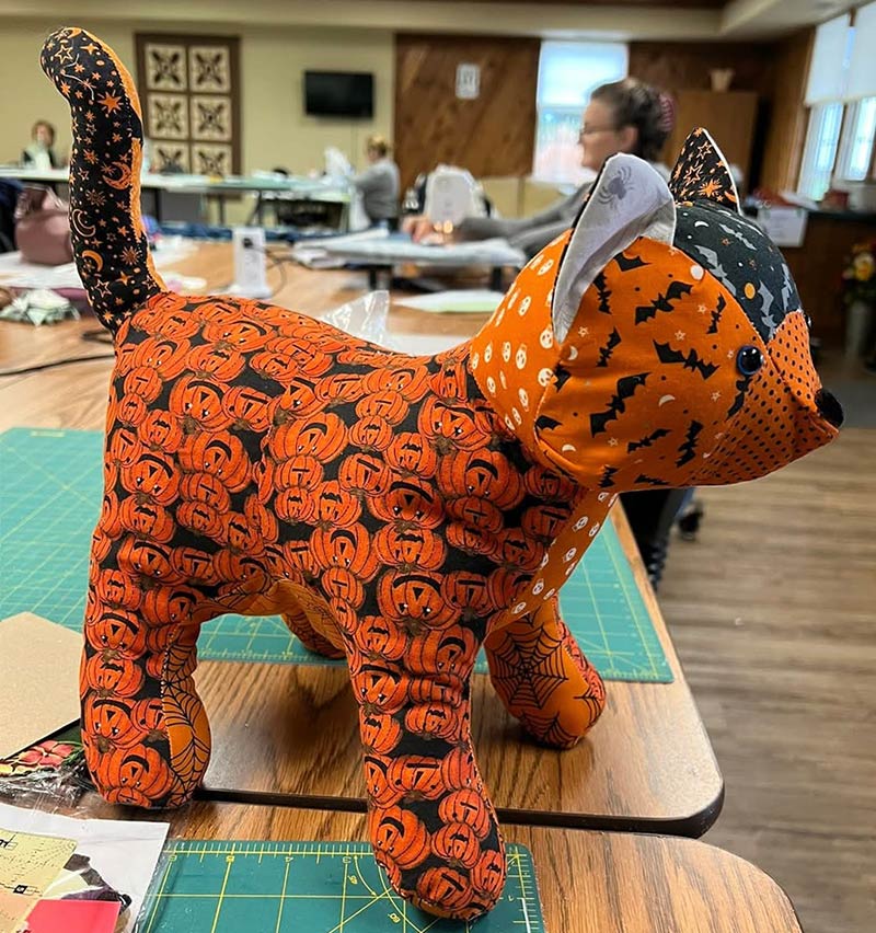 Chari Cure said she used scraps of Halloween fabric to sew this Patch Pussycat for her granddaughter. Patch Pussycat is designed to use several different fabrics for a “patchwork” effect, and I think that’s why this pattern is so popular every year for using up Halloween fabric fat quarter packs.