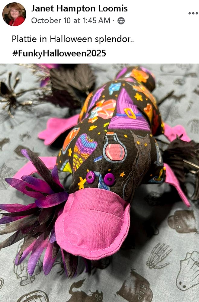Janet Hampton Loomis entered her Plattie Patypus sewn in a cute Halloween fabric print – who knew Plattie would look so pretty covered in black cats and witches’ hats!