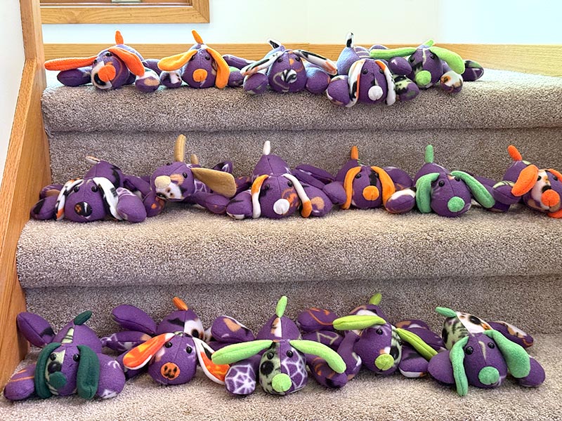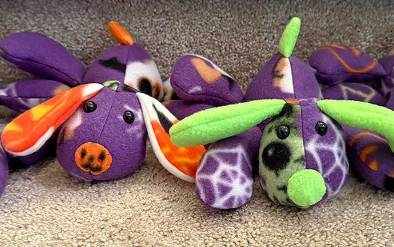 Ellen Kasper sewed a whole lot of Puppy Pete Dogs from fun Halloween fleece fabrics… this would be a cute way to give every grandchild their own unique toy!