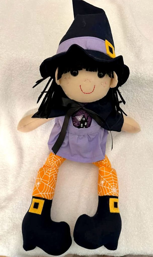 This sweet Whitney Witch Pattern. Kerry Hansen made Whitney with spider web lace stockings! The orange really pops against the other colors in the toy.