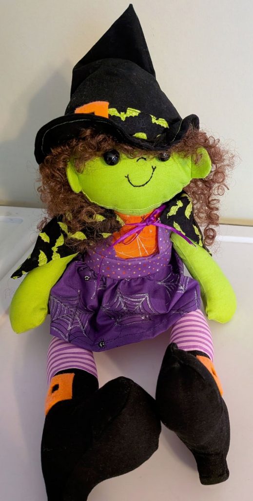 Next is this red-headed Whitney Witch by Sandra Scaggs. She has some striped stockings, showing you don’t have to use Halloween fabric on a witch.