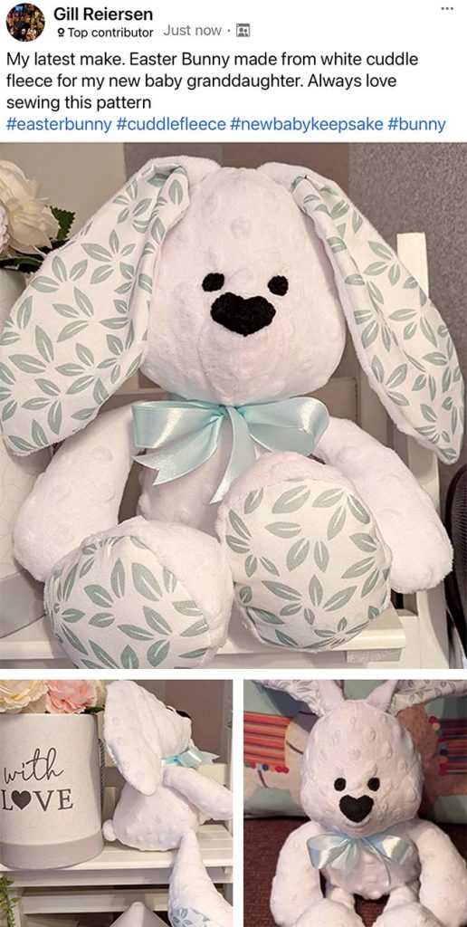 The Easter Bunny Buddy is a great toy to sew for a a baby’s first Easter, like Gill Reiersen did for her new baby granddaughter.