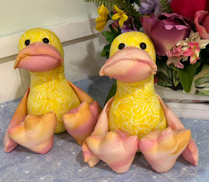 Dilby Duck looks great in batik fabrics like this pair sewn in cheerful batik fabrics by Teri Wolff.
