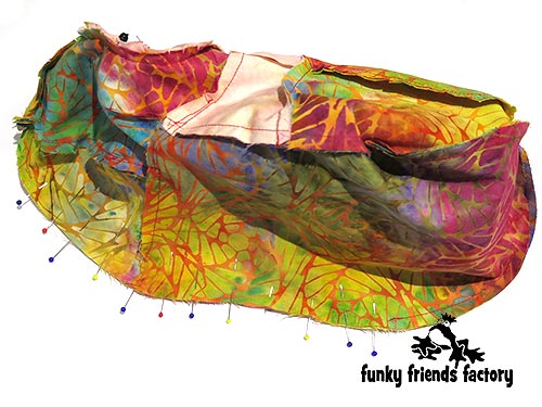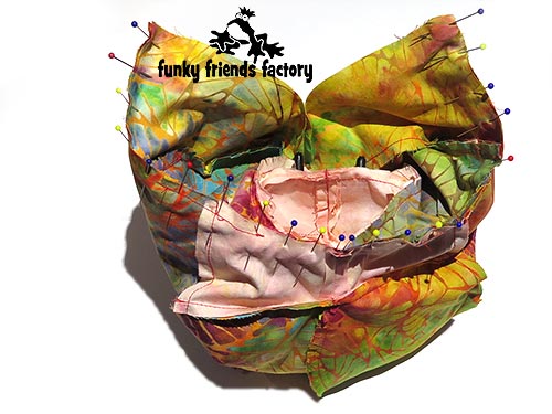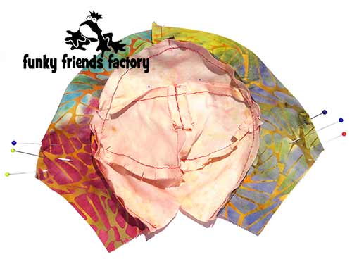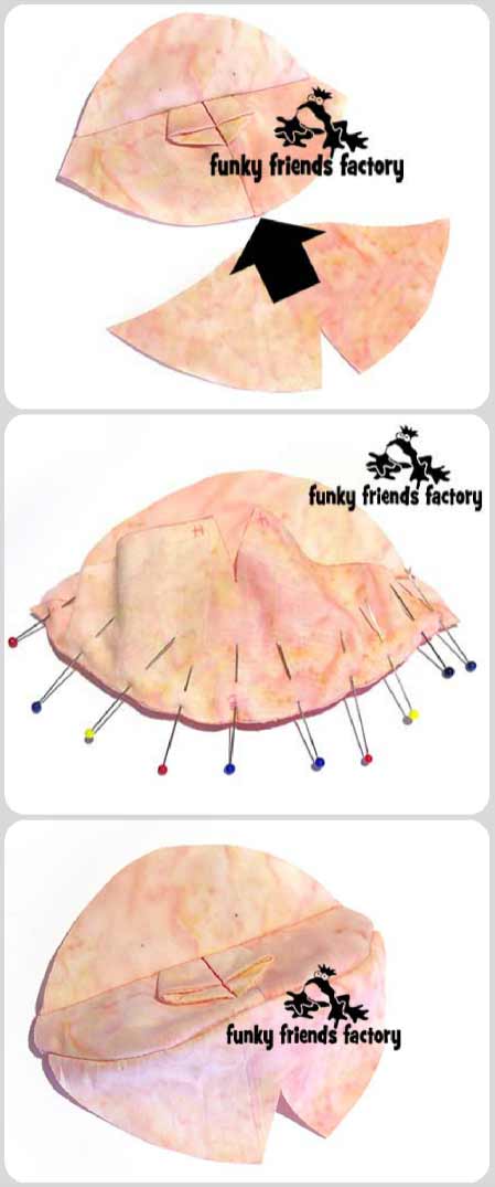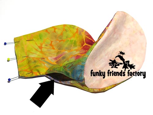 TIP: I find the easiest way to do this is to turn the head right sides out and position it inside the CHEST,TUMMY & BACK PIECES so you can pin the pieces with the fabric right sides together.