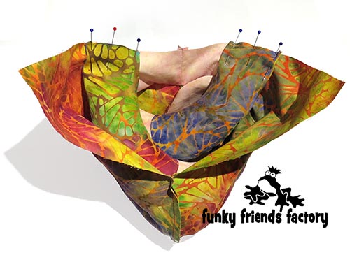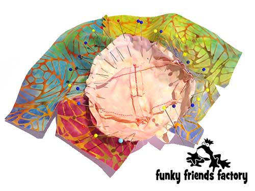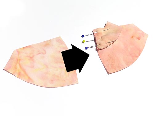 Pin the ARMS to the CHEST & BACK PIECES, using the star pattern markings to guide you, making sure that the ‘thumbs’ face the middle front (towards the TUMMY PIECE).