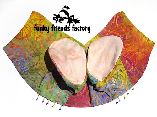 Stuff the EARS with a little bit of toy stuffing and pin them to the HEAD PIECES using the pattern markings to guide you.