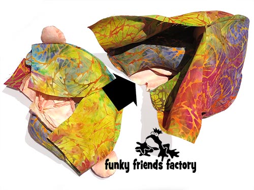 Sew the ARM & HAND PIECES together, leaving them open at the top for turning. Clip the seams well and turn the ARMS right sides out.