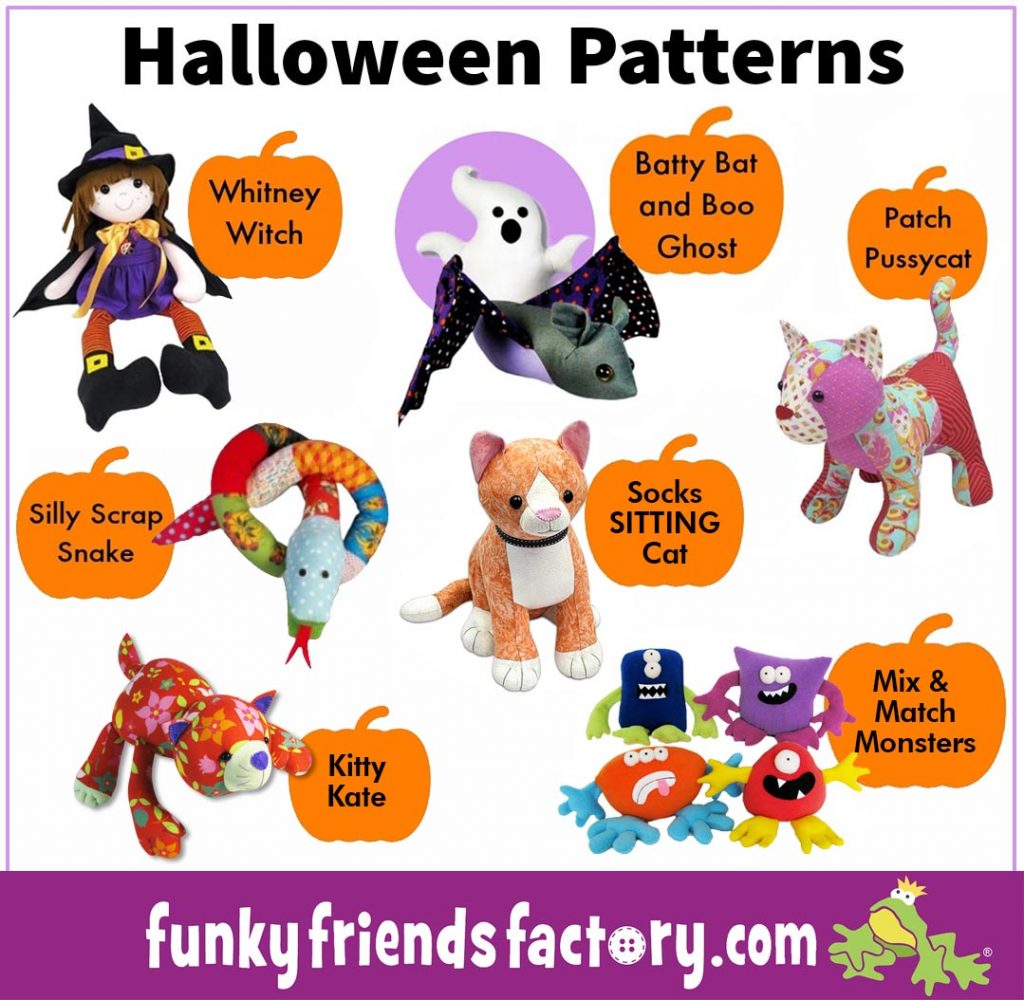 If you’re looking for a fun Halloween soft toy to sew this year – these are some of the most popular Funky Friends Factory Halloween toy patterns AND we also had a NEW addition this year with Socks the SITTING Cat pattern being added to the usual Halloween suspects!