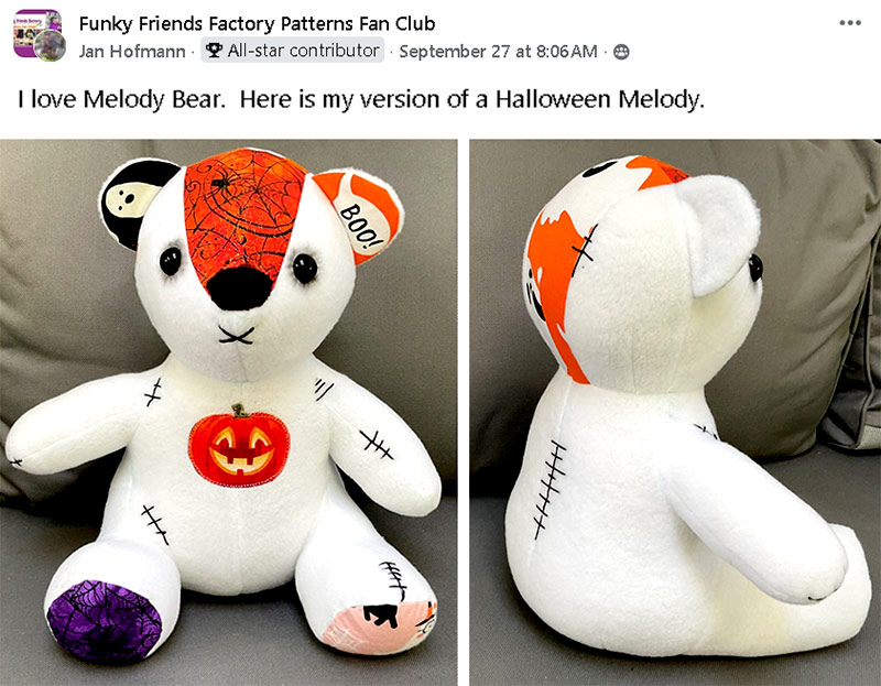 This fabulous Halloween version of Melody Memory Bear was sewn by Jan Hofmann… I LOVE the extra large black stitches she added!Β