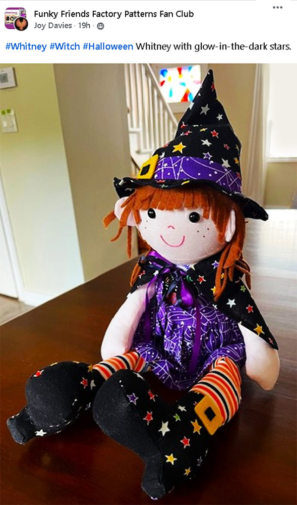 Some spooky cute Halloween toys have been popping up in our pattern fan club FB group like this this super cute Whitney Witch sewn by Joy Davies who used glow-in-the dark stars for the witches hat, cape and boots!