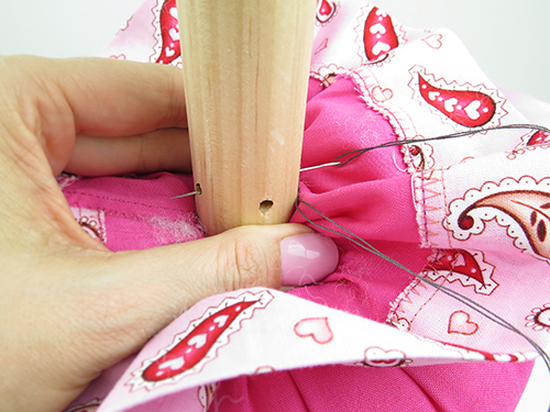 Pass the needle back through the fabric and secure the fabric to the dowel stick by sewing back and forth through the holes in the dowel. I like to make sure that the head is very secure, so I repeat this step with a second piece of thread.