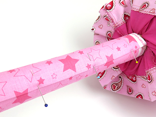 Press the piece of fabric in half lengthwise with the right sides out. Glue the longest raw edges of the fabric to the dowel along its length. Allow the glue to dry then wrap the fabric tightly around the dowel and pin the folded edge down, so the fabric is wrapped nice and tightly around the dowel stick.