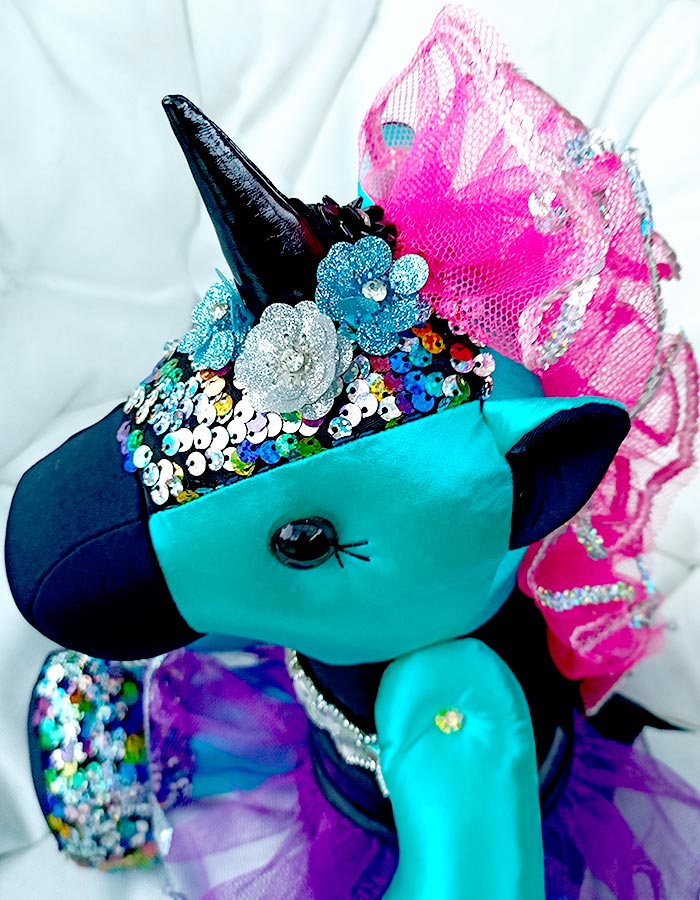 Dance costumes can provide lots of glitzy upcycle options. Here’s a Kelsey Keepsake Unicorn sewn by Mellissa Klumppย with a mane made from a dance tutu that was trimmed in sequins.