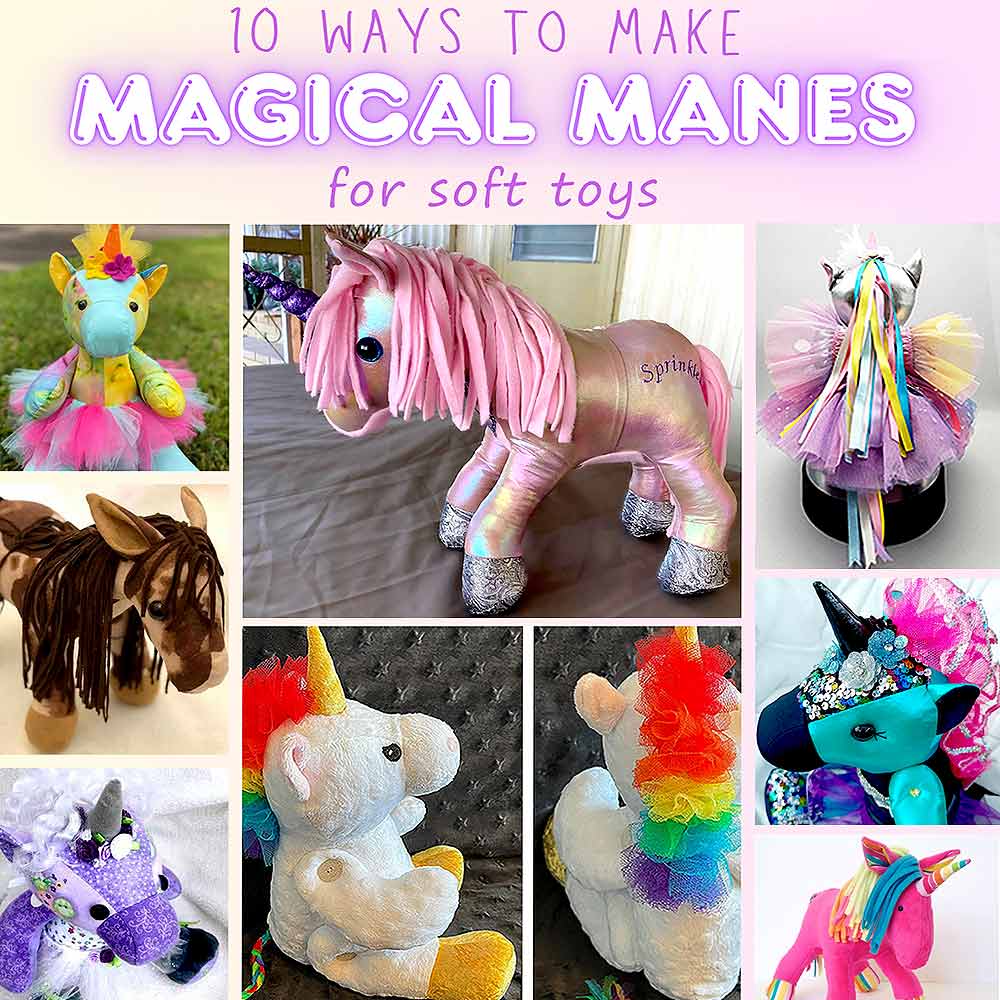 If you’ve got lots of craft supplies in your sewing room, take a look through them and see what might look good as a mane on your toy. Funky fans have often used faux fur, which you can see in some examples below. Upholstery fringe and feather boas make a dramatic statement, but be prepared to experiment in attaching these more unusual materials.