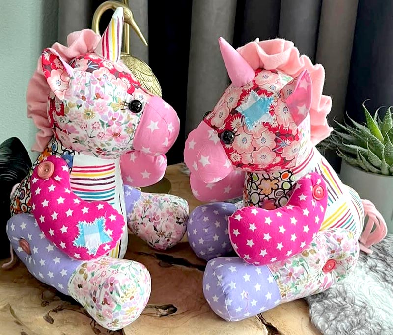 This cute Kelsey Keepsake Unicorn was sewn by Jenny Taylor Beardmore who used the knit fabric from the baby clothes to create a soft pretty mane.