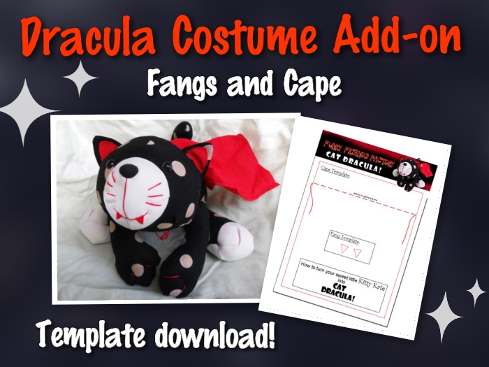 She made it using the Kitty Kate Dracula costume pattern ADD-ON that I published in 2011. It’s a FREE PDF pattern for a Dracula cape and FANGS!!!
