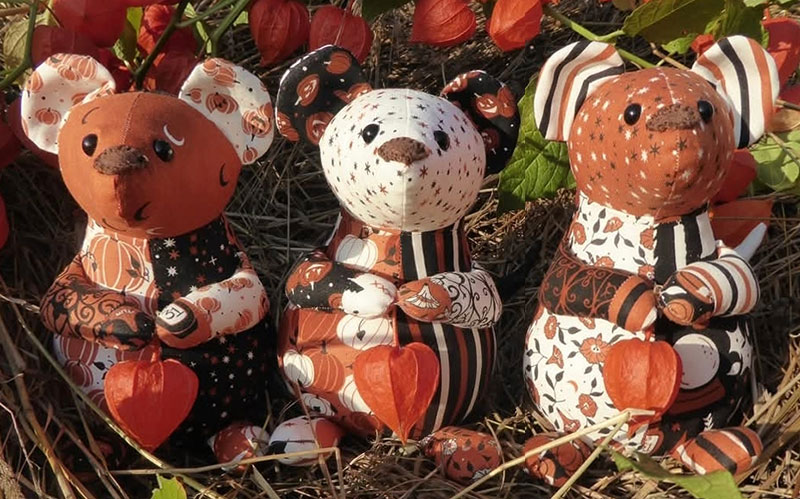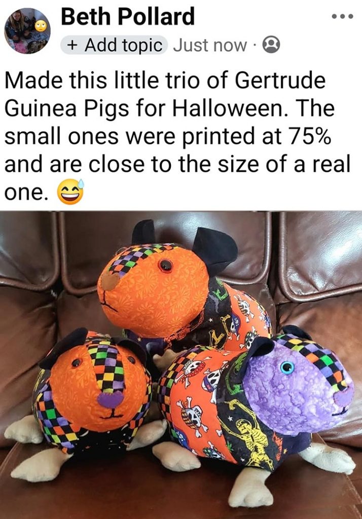 Gertrude Guinea Pig is a great project for using up seasonal fat quarters because she’s meant to have a patchwork look. Beth Pollard used matching Halloween fabric to sew up several Guinea Pigs in varying sizes.