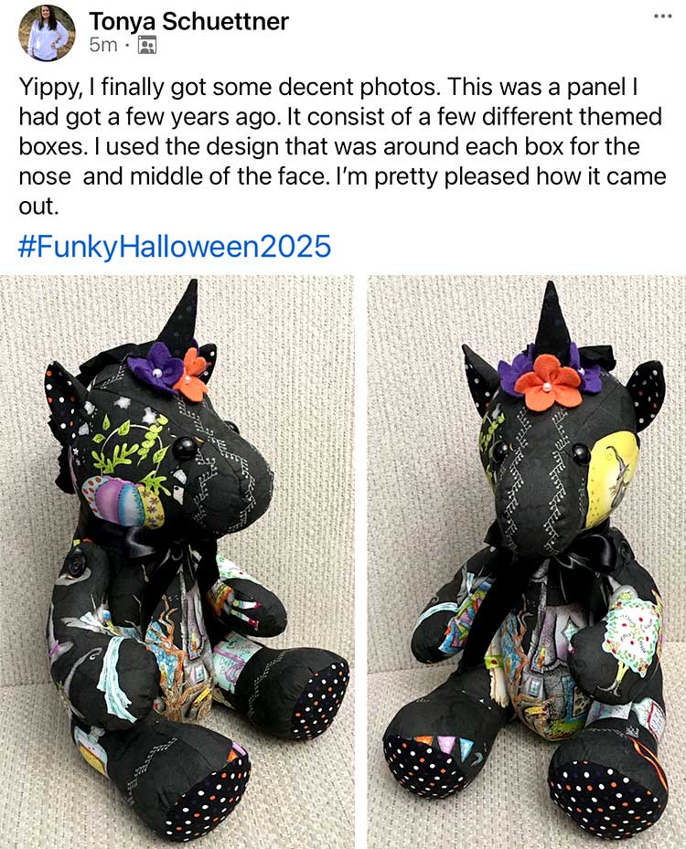 Wow, there’s a lot of fussy-cutting involved in this Kelsey Keepsake Unicorn. Tonya Schuettner explains in her caption how she used Halloween fabric panels for the project.