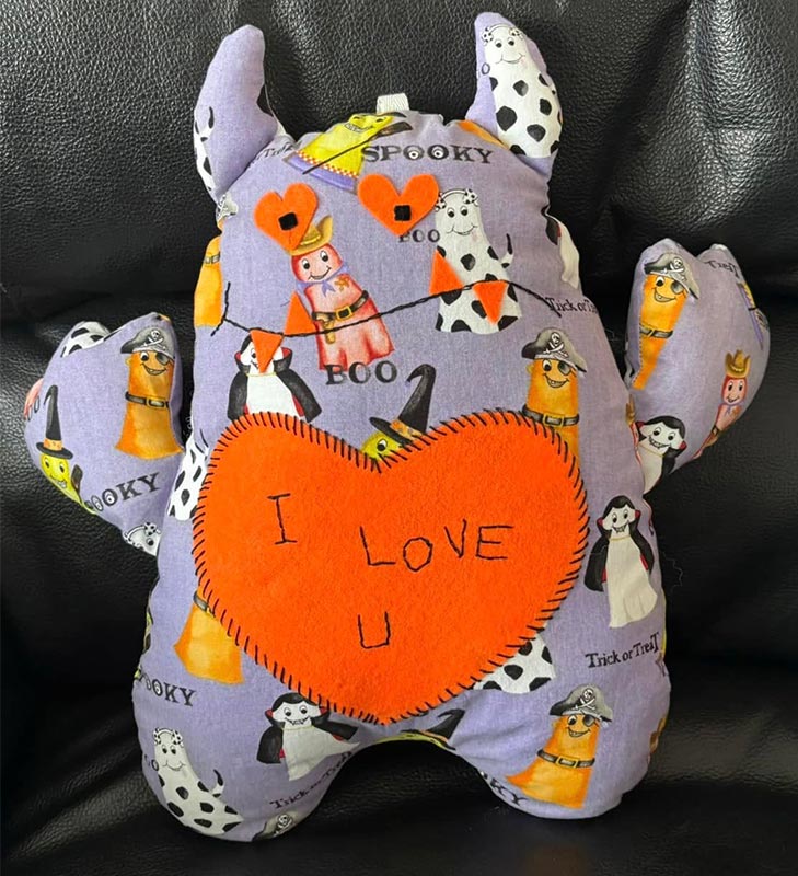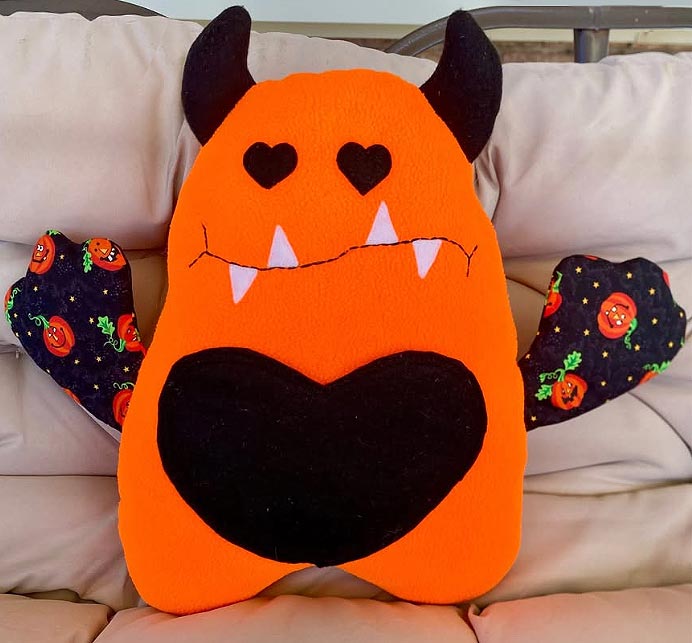 Paula Blevins made this Love Monster into a Halloween hit with orange fleece and patterned accent fabric on the arms.